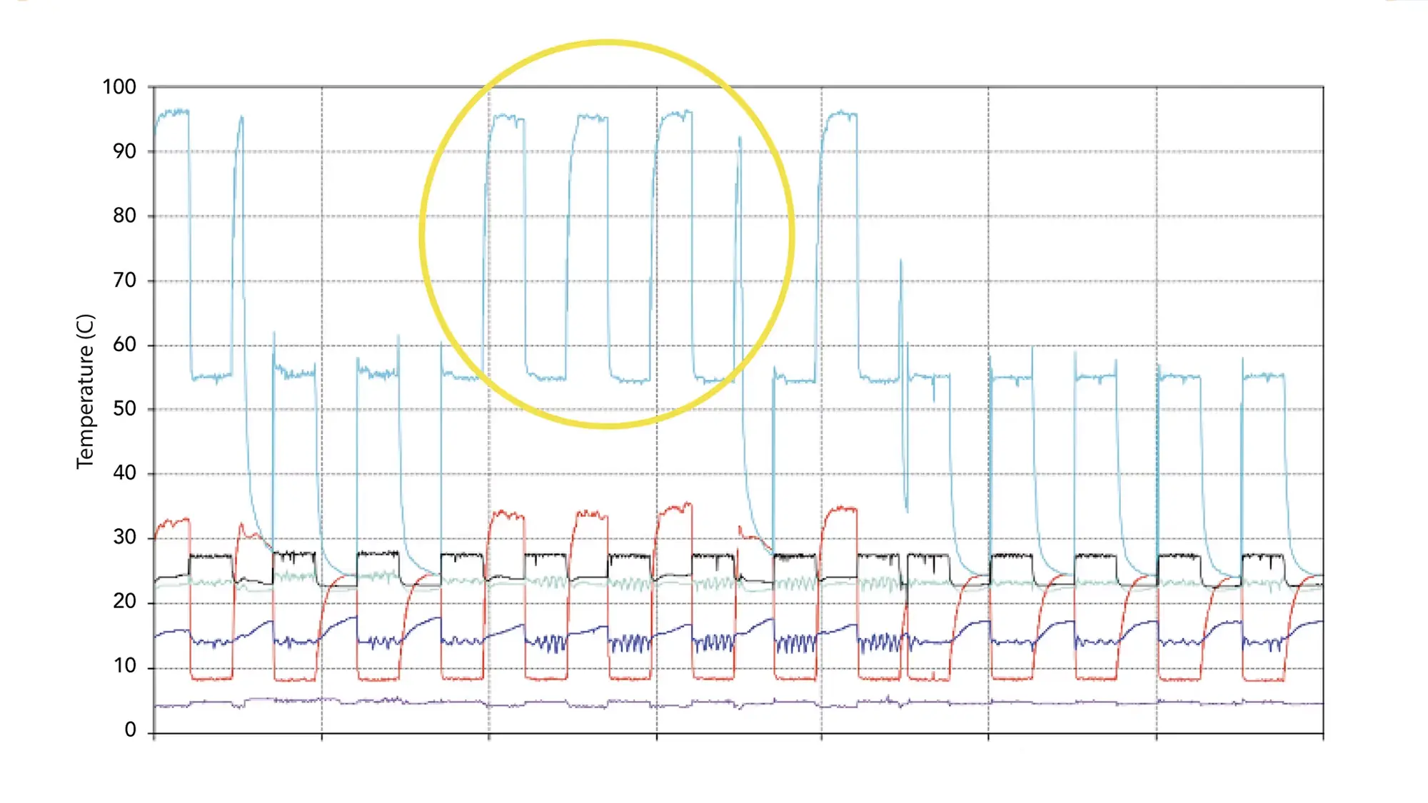 In this instance, an electrical malfunction led to a hot gas valve failure in their 5°C cold room which has redundant cooling systems. When the alternate refrigeration system was supposed to be off, the hot gas valve was fully opened instead of being fully closed. The hot gas valve was operating at double the temperature required, causing overheated gas to circulate throughout the system when it was supposed to be cooling off. Despite the malfunction, the chamber temperature was not affected since the redundant compressor was operational. The issue would have continued and massively increased wear and tear on the refrigeration system.